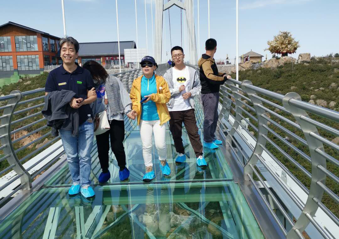 14日下午游覽車載著一行人行駛在山間的小路上,清風(fēng)徐徐,好不愜意,接著迎來了全長(zhǎng)639米的玻璃棧道挑戰(zhàn),驚心動(dòng)魄,姿態(tài)百出。